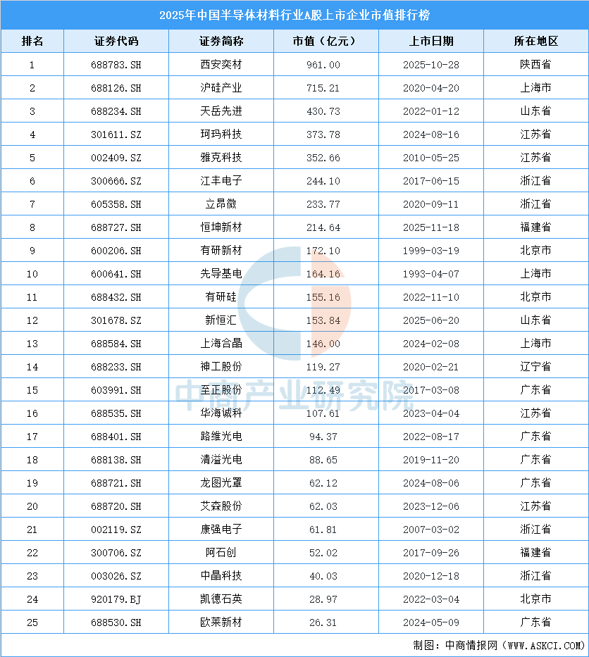 2025年中国半导体材料行业A股上市公司市值排行榜(附榜单) 中商产业研究院 2026-01-04 16:39