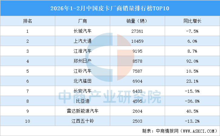 2026年2月中国皮卡厂商销量排行榜TOP10(附榜单)