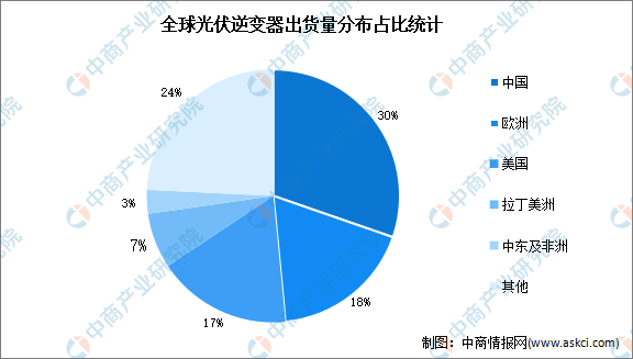 中国、美国和欧洲作为光伏产业的主要市场,同样为光伏逆变器出货量最大的国家和地区。2020年,全球光伏逆变器出货量分布占比中,中国、欧洲、美国分别为30%、18%、17%。拉丁美洲、中东及非洲占比分别为7%、3%。