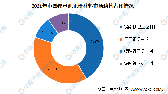 2021年锂电池正极材料中,磷酸铁锂正极材料出货量45.5万吨,占比最多,达41.6%。在连续五年出货量落后三元的情况下实现反超,磷酸铁锂正极材料成为正极材料细分领域出货量最多,且增长速度最快的子行业。其次分别为三元正极材料、锰酸锂正极材料、钴酸锂正极材料,占比分别为38.6%、10.1%、9.8%。