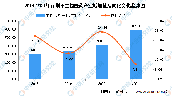 深圳市国民经济和社会发展统计公报数据显示,2018年,深圳市生物医药产业增加值298.58亿元,增长22.3%;2019年,深圳市生物医药产业增加值337.81亿元,增长13.3%;2020年,深圳市生物医药产业增加值408.25亿元,增长24.4%;2021年,深圳市生物医药与健康产业增加值589.60亿元,增长7.6%。