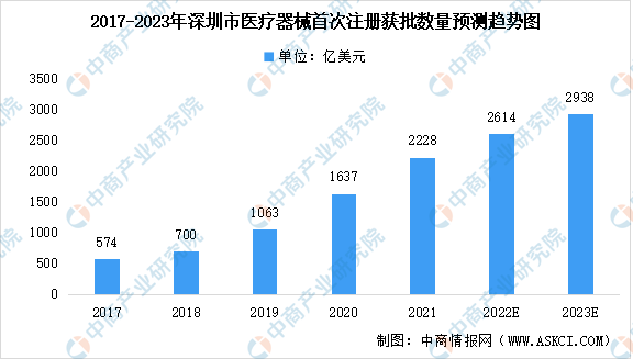 2021年,深圳市首次获批医疗器械为2228件。整体而言,深圳市近年来首次获批注册器械数呈现上升趋势,尤其是在2018年之后,增速较为明显。特别是受疫情影响,对诊断、治疗、防护的需求带动了医疗器械产出大幅增加,深圳市于2020、2021年主要获批产品为体外诊断试剂和防护器械,尤其在2020年深圳医疗器械出口位居全国各大城市之首。预计2023年深圳深圳市首次获批医疗器械将达2938件。