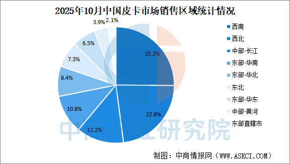 皮卡市场的主力区域以西南、西北为主,西部地区的皮卡需求较大。10月西南地区和华南、京津沪的皮卡需求表现较强。目前来看,2025年10月西南、西北地区的皮卡需求占到总体需求的48%左右,成为两大核心市场,其中今年西北市场规模较大。