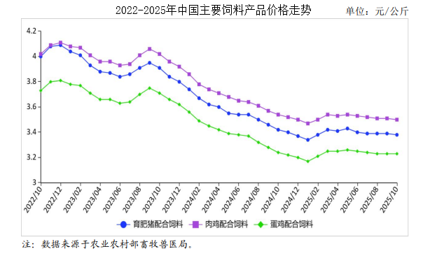 主要原料供给充足、价格下行,饲料价格延续缓慢下跌走势。10月份育肥猪、肉鸡、蛋鸡配合饲料月均价分别为每公斤3.38元、3.50元、3.23元,环比分别跌0.3%、跌0.3%、持平,同比分别跌1.2%、跌1.1%、跌0.3%。从周数据来看,育肥猪、肉鸡、蛋鸡配合饲料价格均呈现持续微幅下跌态势。