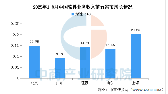 北京、广东、江苏、山东、上海软件业务收入居全国前5,同比分别增长14.9%、9.2%、14.3%、13.4%和20.2%。