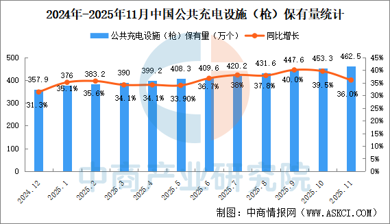 2025年11月全国公共充电设施运营情况:保有量同比增长36%(图) 中商产业研究院 2025-12-25 10:50