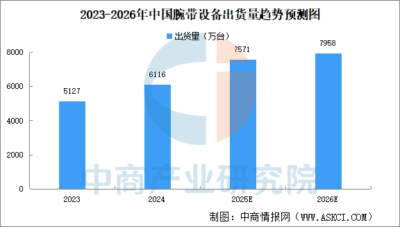 中国腕戴设备的出货量近年来呈现波动增长态势。中商产业研究院发布的《2025-2030年中国可穿戴设备行业分析与发展前景预测研究报告》显示,2024年中国腕戴设备出货量为6116万台,同比增长19.3%。中商产业研究院分析师预测,2025年中国腕戴设备出货量将超7500万台,2026年中国腕戴市场出货量将达7958万台,同比增长5.1%。