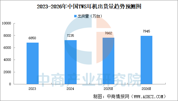 中国TWS耳机市场已从“野蛮生长”进入“精耕细作”阶段,短期看,出货量将维持低速增长。中商产业研究院发布的《2025-2030年中国TWS耳机行业深度挖掘及投资决策分析报告》显示,2024年中国TWS耳机出货7235万台,同比增长5.6%。中商产业研究院分析师预测,2025年中国TWS耳机出货量将达7662万台,2026年出货量将超7900万台。
