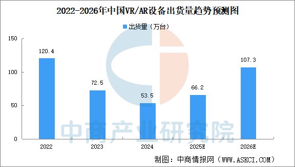 在宏观经济及消费购买力波动等不确定性因素的影响下,中国VR/AR市场持续疲软,出货量小幅波动。中商产业研究院发布的《扩展现实系列专题之中国VR/AR市场发展季报》显示,2024全年中国VR/AR市场出货约53.5万台,同比下滑26.3%。受到产品技术革新、AI加成以及新厂商入局的大力拉动,中国VR/AR市场将迎来回暖。中商产业研究院分析师预测,2025年中国VR/AR市场出货量将超66万台,2026年中国AR/VR设备出货量将达107.3万台,同比增长62.1%。