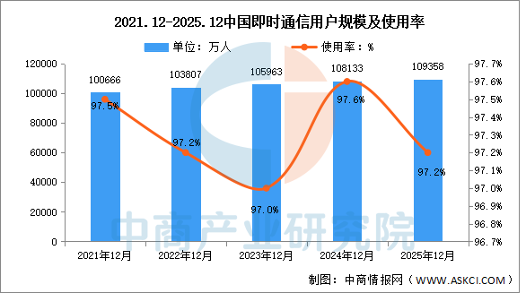 中商情报网讯:截至2025年12月,我国即时通信用户规模达10.94亿人,较2024年12月增长1225万人,占网民整体的97.2%。