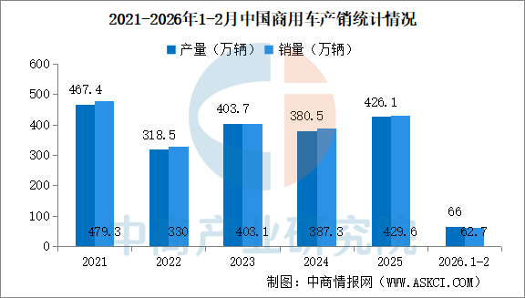 2026年2月,商用车产销分别完成27.3万辆和26.9万辆,环比分别下降29.7%和24.9%,同比分别下降14.1%和14%。2026年1-2月,商用车产销分别完成66万辆和62.7万辆,同比分别增长7%和3.9%。