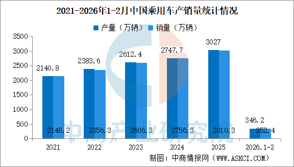 2026年2月,乘用车产销分别完成140万辆和153.6万辆,环比分别下降32.1%和22.7%,同比分别下降21.6%和15.4%。2026年1-2月,乘用车产销分别完成346.2万辆和352.4万辆,同比分别下降12%和10.7%。