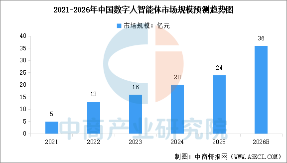 在AI技术的演进进程中,数字人智能体已成为当前商业化程度最高、落地较为成熟的技术形态之一。中商产业研究院发布的《2026-2031年中国智能体(AI Agent)市场调研分析及投资前景研究预测报告》显示,中国数字人智能体行业市场规模将从2021年的5亿元增加至2024年的20亿元,复合年增长率为55.8%,2025年市场规模约为24亿元。中商产业研究院分析师预测,2026年中国数字人智能体市场规模将达到36亿元。