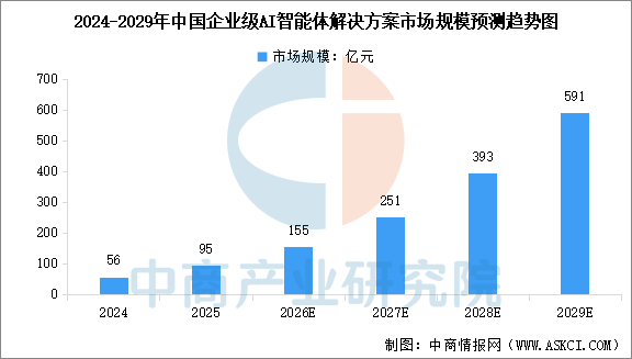 企业级AI智能体解决方案是指以大语言模型和多智能体体系为核心,面向企业内部运营、管理与决策环节,提供可理解、可执行、可协作的智能任务代理服务的系统化方案。中商产业研究院发布的《2026-2031年中国智能体(AI Agent)市场调研分析及投资前景研究预测报告》显示,在技术成熟、数字化需求增长、行业痛点积累、商业模式完善及政策利好等多重驱动下,中国企业级AI智能体解决方案市场规模预计将从2024年的56亿元增至2029年的591亿元,复合年增长率达60.2%。