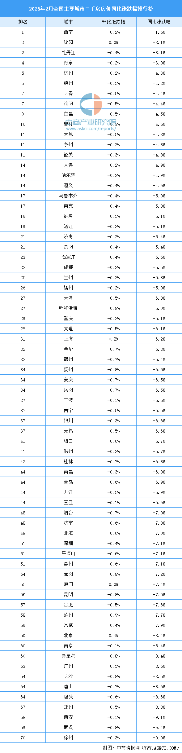 2026年2月全国新房房价涨跌排行榜:上海杭州房价上涨(图)