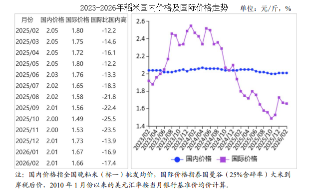 中商情报网讯:2026年2月,国内稻米价格平稳运行,国际米价低位震荡。国内市场:各地学校开学、企事业单位复工复产带动大米集团性消费增加,米企、贸易商存在补库需求,预计稻米价格稳中偏强运行。国际市场:全球大米供应过剩,出口市场竞争加剧,预计国际米价偏弱运行。