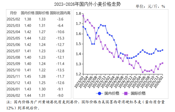 中商情报网讯:2026年2月,国内外小麦价格均上涨。国内市场:随着学校陆续开学,面粉加工企业或将出现阶段性补库需求,对麦价形成一定支撑,但市场粮源供给基本充足,预计短期内国内小麦价格以稳为主。国际市场:埃及、印度尼西亚、阿尔及利亚等主要进口国口粮刚性需求依然存在,对价格形成支撑,预计短期内国际小麦价格小幅波动上涨。