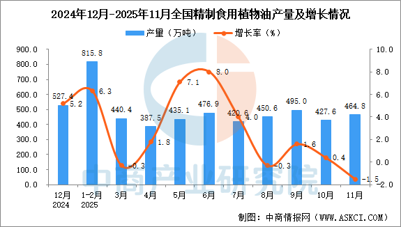 2025年11月全国精制食用植物油产量数据统计分析 中商产业研究院 2025-12-23 14:04