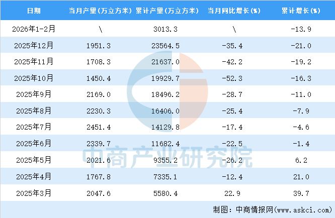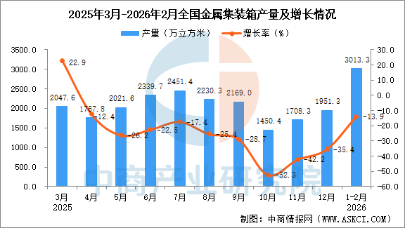 中商情报网讯:据中商产业研究院数据库,2026年1-2月全国金属集装箱当月产量与去年同期相比下降。2026年1-2月全国金属集装箱产量3013.3万立方米,同比下降13.9%。
