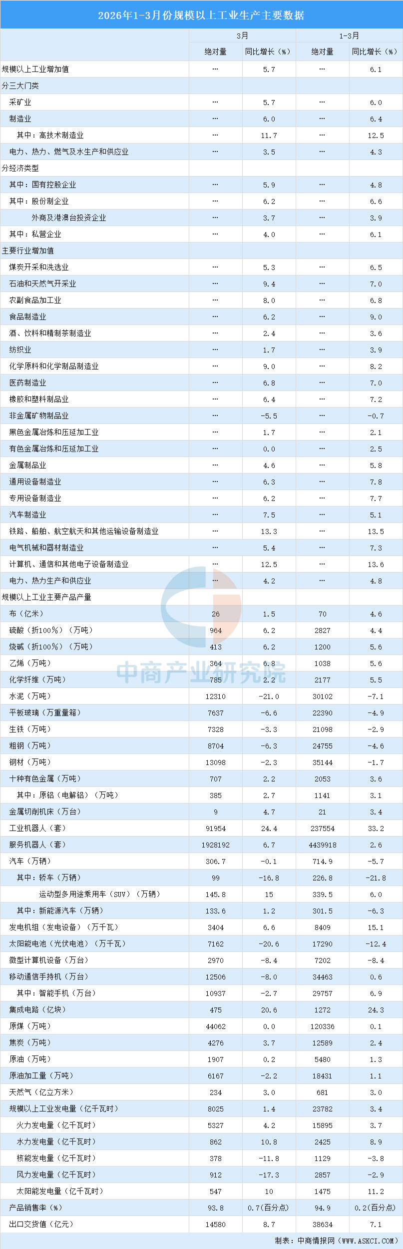 分三大门类看,3月份,采矿业增加值同比增长5.7%,制造业增长6.0%,电力、热力、燃气及水生产和供应业增长3.5%。