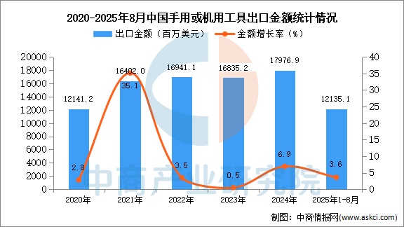从金额方面来看,数据显示,2025年1-8月中国手用或机用工具出口金额12135.1百万美元,同比增长3.6%。