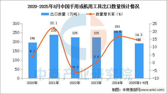 2025年1-8月中国手用或机用工具出口数据统计分析:出口量同比增长14.3% 中商产业研究院 2025-10-14 08:33