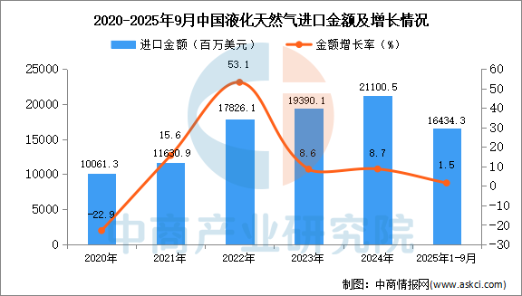 2025年1-9月中国气态天然气进口数据统计分析:进口量同比增长8.2% 中商产业研究院 2025-10-28 17:19