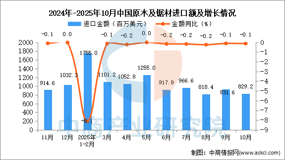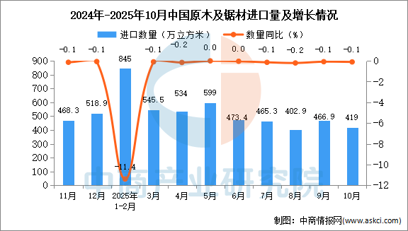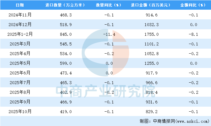 2025年10月中国原木及锯材进口数据统计分析:进口量419万立方米 中商产业研究院 2025-11-14 08:46