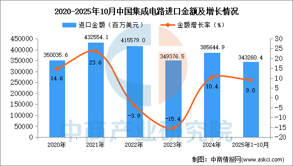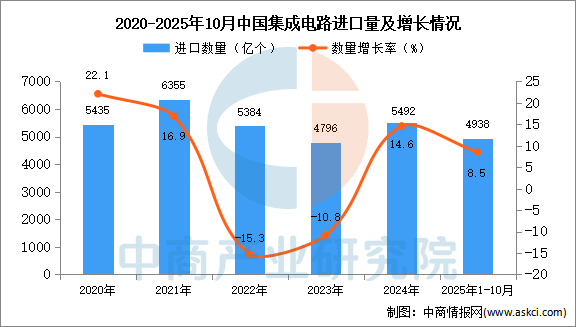 2025年1-10月中国集成电路进口数据统计分析:进口量同比增长8.5% 中商产业研究院 2025-11-27 08:45