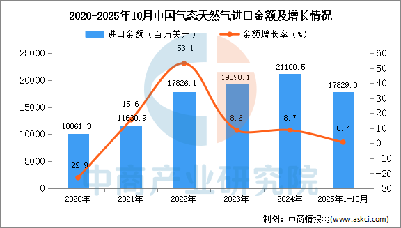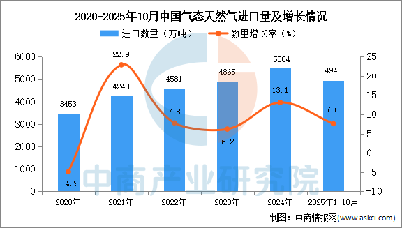 2025年1-10月中国气态天然气进口数据统计分析:进口量同比增长7.6% 中商产业研究院 2025-12-01 08:36