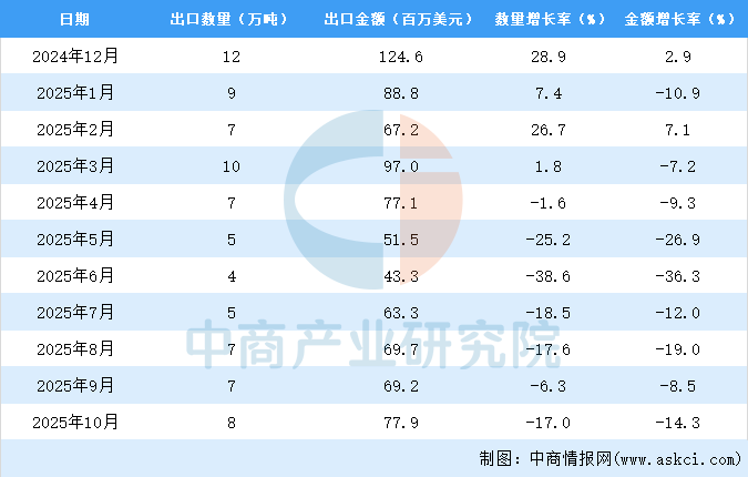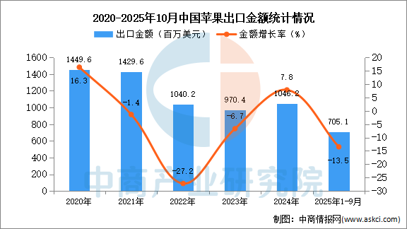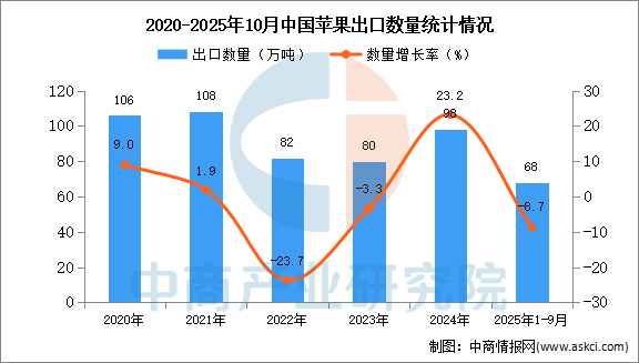 2025年1-10月中国苹果出口数据统计分析:出口量同比下降8.7% 中商产业研究院 2025-12-03 09:18