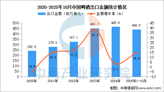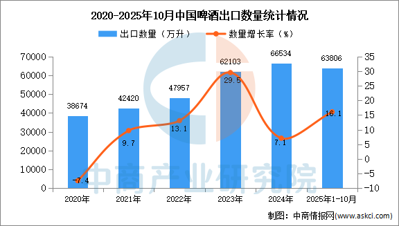 2025年1-10月中国啤酒出口数据统计分析:出口量同比增长16.1% 中商产业研究院 2025-12-03 09:44