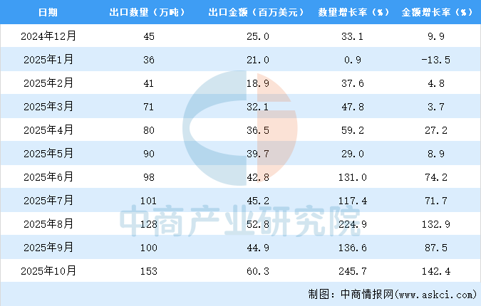2025年10月中国水泥及水泥熟料出口量及金额增长情况