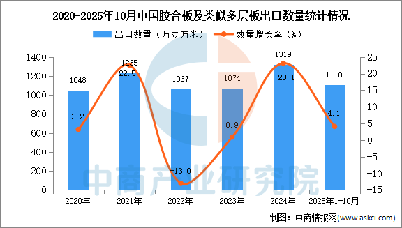 中商情报网讯:据中商产业研究院数据库显示,2024年我国胶合板及类似多层板出口量1319万立方米,同比增长23.1%。最新数据显示,2025年1-10月中国胶合板及类似多层板出口量1110万立方米,同比增长4.1%。
