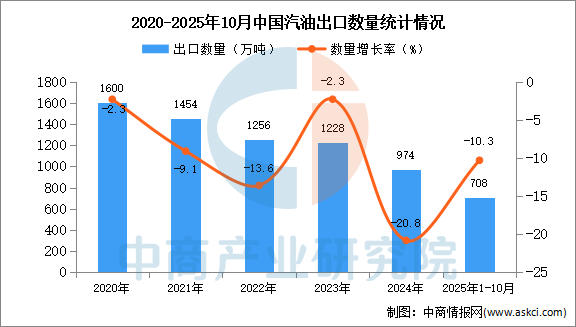 2025年1-10月中国汽油出口数据统计分析:出口量同比下降10.3% 中商产业研究院 2025-12-05 09:30