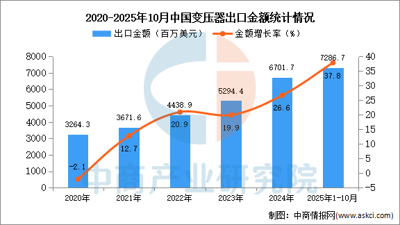 2025年1-10月中国变压器出口数据统计分析:出口量同比增长4.3% 中商产业研究院 2025-12-09 08:33