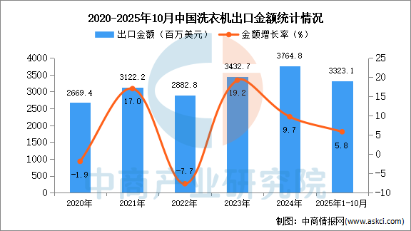 2025年1-10月中国洗衣机出口数据统计分析:出口量同比增长7.4% 中商产业研究院 2025-12-09 08:48