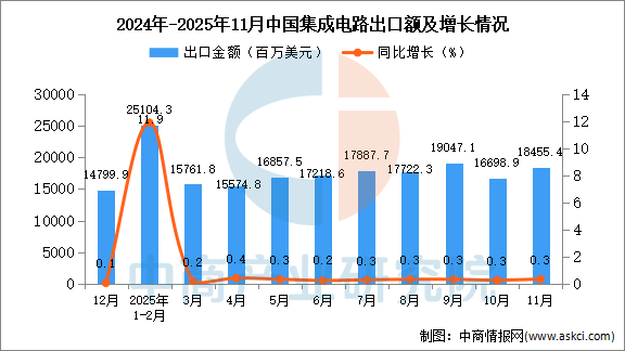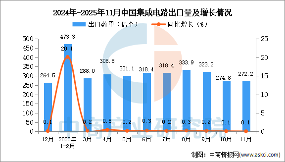 2025年11月中国集成电路出口数据统计分析:出口量同比增长0.1% 中商产业研究院 2025-12-19 08:51