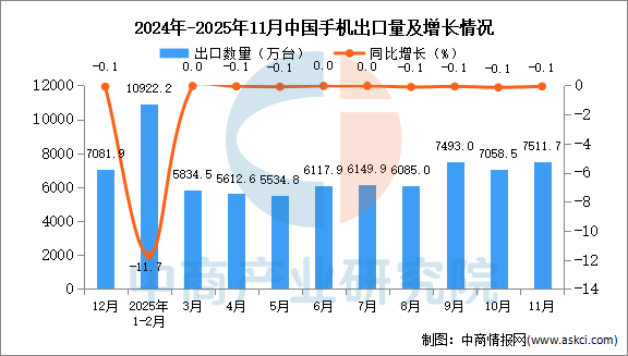 2025年11月中国手机出口数据统计分析:出口量7511.7万台 中商产业研究院 2025-12-19 09:08