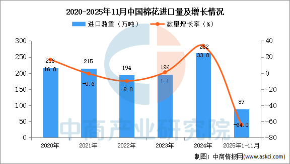 2025年1-11月中国棉花进口数据统计分析:进口量同比下降64% 中商产业研究院 2025-12-31 11:06
