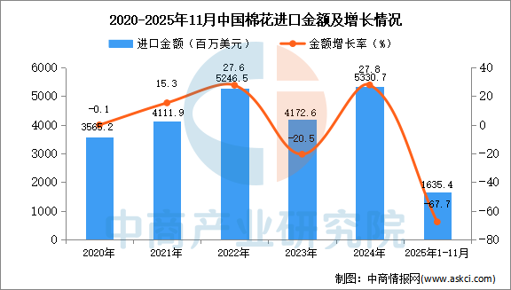2025年11月中国棉花进口量及金额增长情况