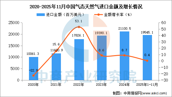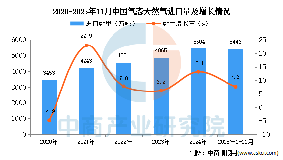 2025年1-11月中国气态天然气进口数据统计分析:进口量同比增长7.6% 中商产业研究院 2025-12-31 11:10
