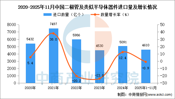 中商情报网讯:据中商产业研究院数据库显示,2024年中国二极管及类似半导体器件进口量5091亿个,同比增长12.4%。最新数据显示,2025年1-11月中国二极管及类似半导体器件进口量4610亿个,同比下降0.9%。