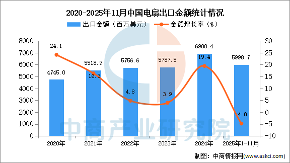 2025年11月中国电扇出口量及金额增长情况