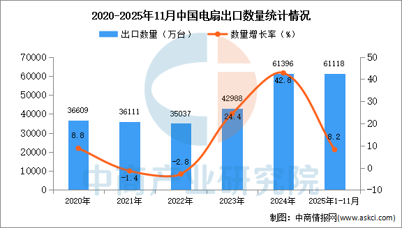 中商情报网讯:据中商产业研究院数据库显示,2024年中国电扇出口量61396万台,同比增长42.8%。最新数据显示,2025年1-11月中国电扇出口量61118万台,同比增长8.2%。