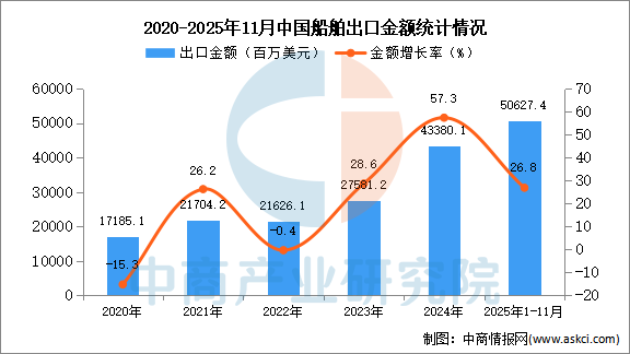 从金额方面来看,数据显示,2025年1-11月中国船舶出口金额50627.4百万美元,同比增长26.8%。