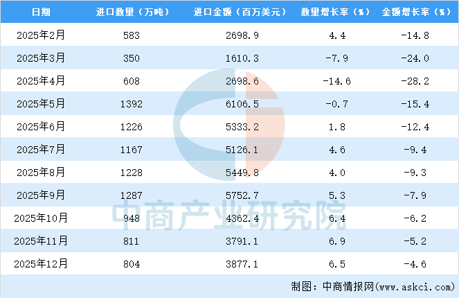 2025年12月中国大豆进口量及金额增长情况
