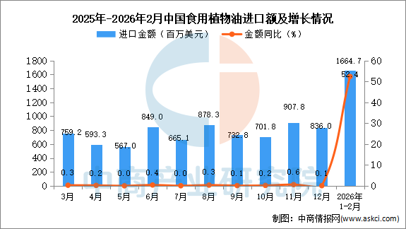 从金额方面来看,2026年1-2月中国食用植物油进口金额1664.7百万美元,同比增长52.4%;1-2月我国食用植物油累计进口金额1664.7百万美元,同比增长52.4%。