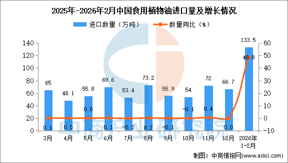 2026年1-2月中国食用植物油进口数据统计分析:进口量133.5万吨 中商产业研究院 2026-03-13 09:07