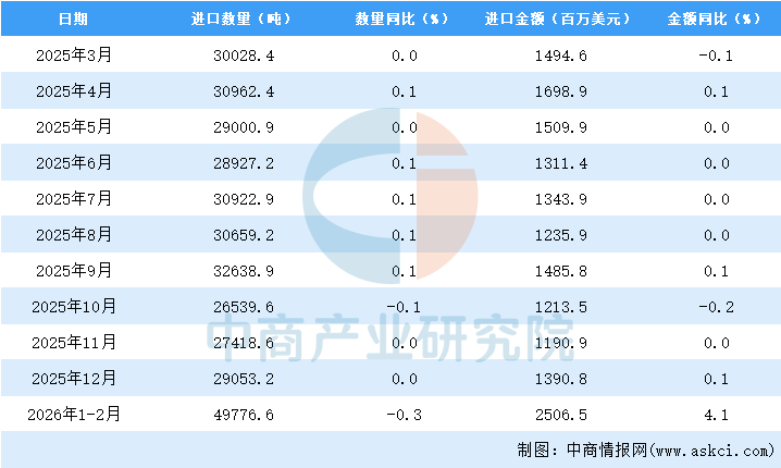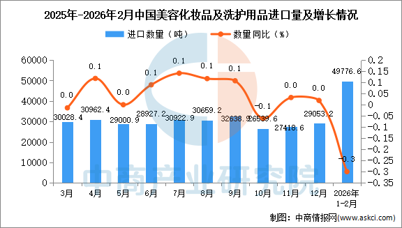 2026年1-2月中国美容化妆品及洗护用品进口数据统计分析:进口量49776.吨 中商产业研究院 2026-03-16 08:52